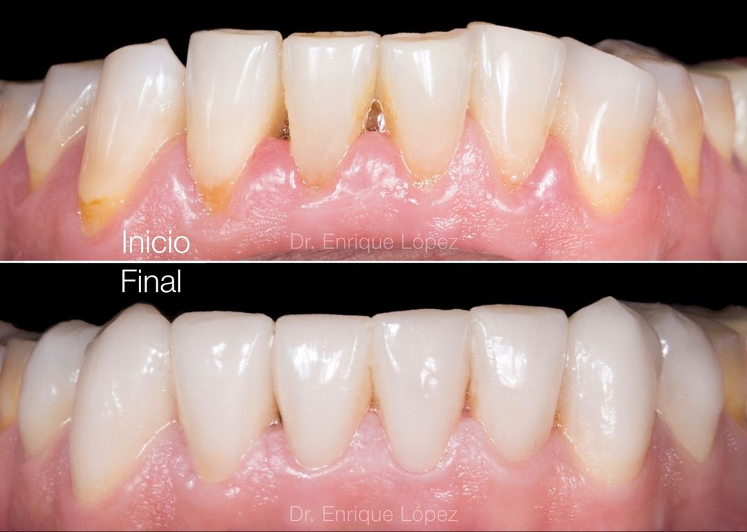 Rejuvenecimiento de sonrisa con carillas de porcelana feldespática sin tallado de los dientes. Hemos devuelto la función y la estética perdidas por el bruxismo a nuestro paciente. Así luce después del tratamiento.